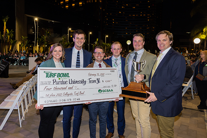 As a part of the 2022 GCSAA Collegiate Turf Bowl, Purdue competed against 41 student teams representing 21 colleges and universities from across the United States. The competition judged teams on overall industry knowledge and problem-solving skills in high-pressure situations, demonstrating what superintendents can face daily. This year, a total of $10,000 in cash and prizes were awarded to the top teams in the competition.