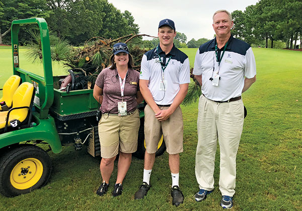 Divot crew on patrol The divot crew was hard at work making sure East Lake’s Meyer Zoysia fairways were spotless. From left to right are Chris Sheffield, Auburn University, Connor Paul, Michigan State University, and Robert Mandrink, Michigan State University.