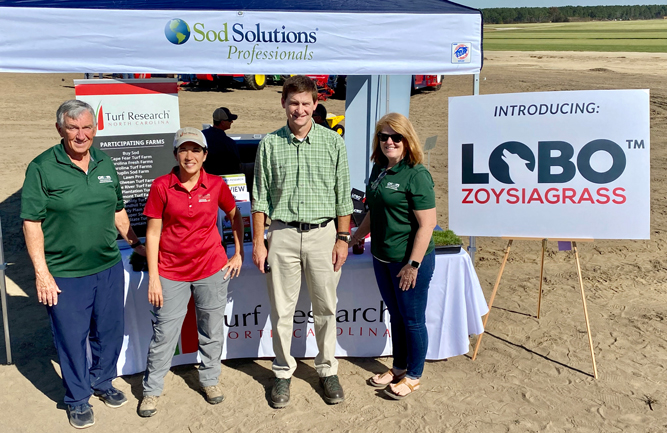 Art Bruneau (Executive Director of NC Sod Producers Association), Dr. Susana Milla-Lewis (NC State), Dr. Grady Miller (NC State) and Linda Bradley (President of NCSPA) at the Lobo Zoysiagrass release at the NC Sod Producers Association Fall Field Day. (Photo courtesy of Sod Solutions)