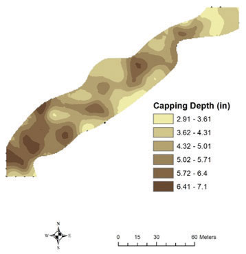 Krigged map extrapolating capping depth from a 20-foot-by-20-foot sampling grid. (Figure: Reagan Hejl)