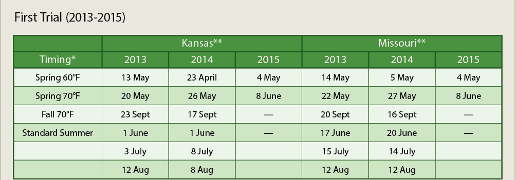 These previous findings suggest the potential for developing a large patch management strategy with a specific nitrogen application scheme. In 2013-2015, a collaborative field study conducted by Kansas State University and the University of Missouri focused on pinpointing the best nitrogen application timing for limiting large patch incidence and determining the impact of nitrogen source on large patch severity. The trial was conducted concurrently at two locations in Manhattan, Kan. (Kansas State University) and in Columbia, Mo. (The University of Missouri). Treatments included ammonium sulfate, calcium nitrate or urea applied in spring or fall when soil temperatures at a 2-inch depth averaged 60 degrees F or 70 degrees F over a five-day period, and a standard summer nitrogen application schedule (Table 1). A follow-up — and ongoing — study at the University of Missouri combines several factors, including nitrogen application timing, nitrogen source and a single spring fungicide application in an effort to develop an integrated strategy for large patch management (Table 2).