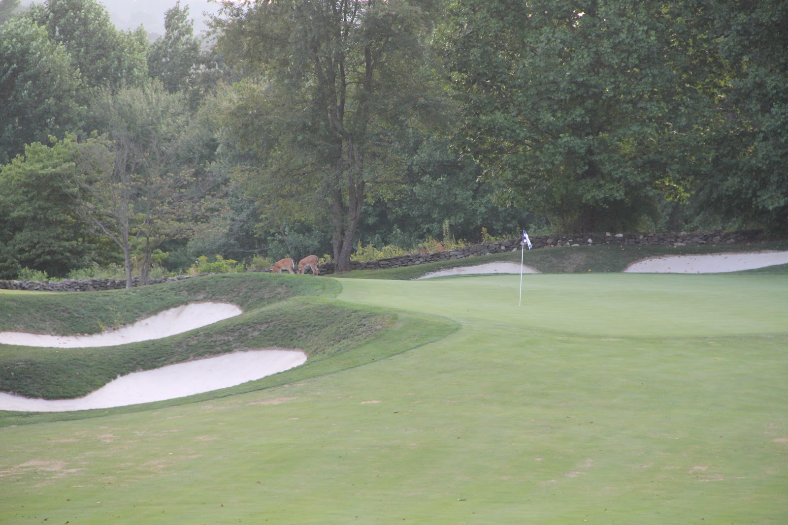 Saw these two deer wandering around 17 green. Pat hit into the bunkers on the left (of course he did!) and the two deer didn’t retreat too far past those trees. They wanted to see if he could get up and down from that bunker, apparently.