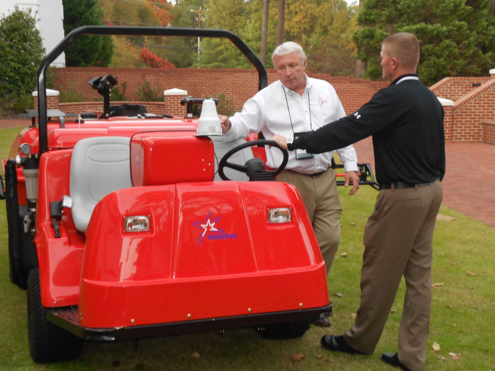 Emil Miller discusses the features on a Smithco sprayer to a superintendent