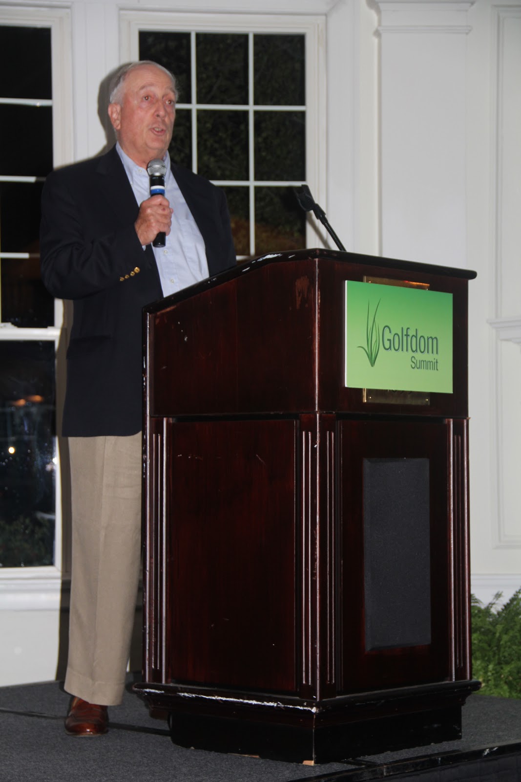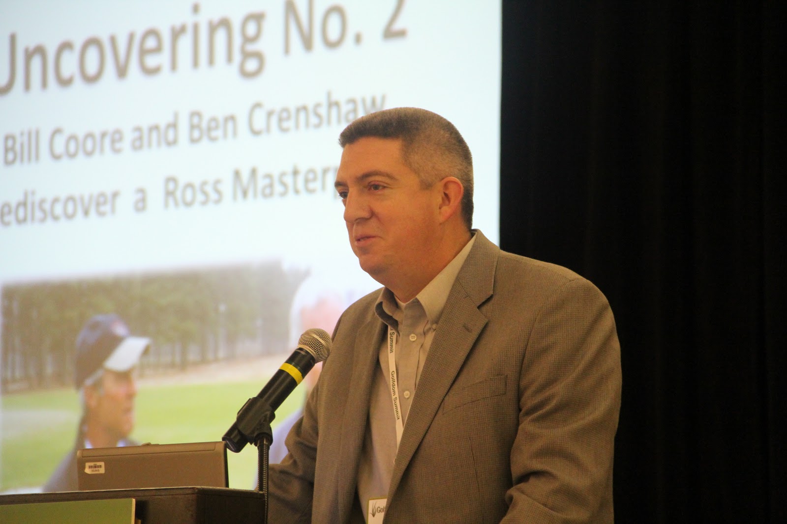 A room full of superintendents listens as Rees Jones makes his keynote address at the Golfdom Summit