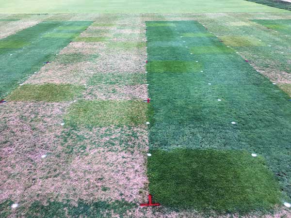 The photo shows plots no longer receiving fungicide applications (left) and those that are treated (right). The five trial runs allowed the Rutgers University team to monitor disease progression through the entire season (April to November). (Photo: James Hempfling)