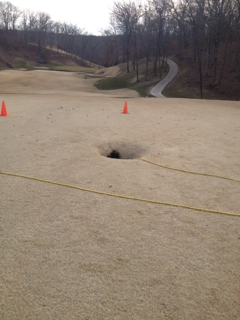 A mighty huge thanks to John Soetaert, CGCS, for sending us these shots of the sinkhole at Annbriar Golf Course. It’s not like he’s got much spare time these days, you know? Check out the immense progress he and his crew have made in repairing the sinkhole—all this in less than a week! For the record, they’ll be ready to sod on Monday. Tell us if this isn’t impressive. Thanks so much for sending them our way, John! We owe you a beer.