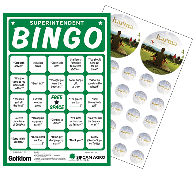 Get your Bingo card now — complete with some of the most common phrases to be uttered on a golf course — because the first 25 readers to post a Bingo (five squares covered in a row vertically, horizontally or diagonally for those of you unfamiliar with the game) on social media and tag @Golfdom and @SipcamAgroTurf will win some gear from Golfdom and a free case of Karma from Sipcam. The first blackout (all 25 squares covered) will receive $1,000 in Sipcam product credit for any enhanced turf quality product, Karma or Coastal.