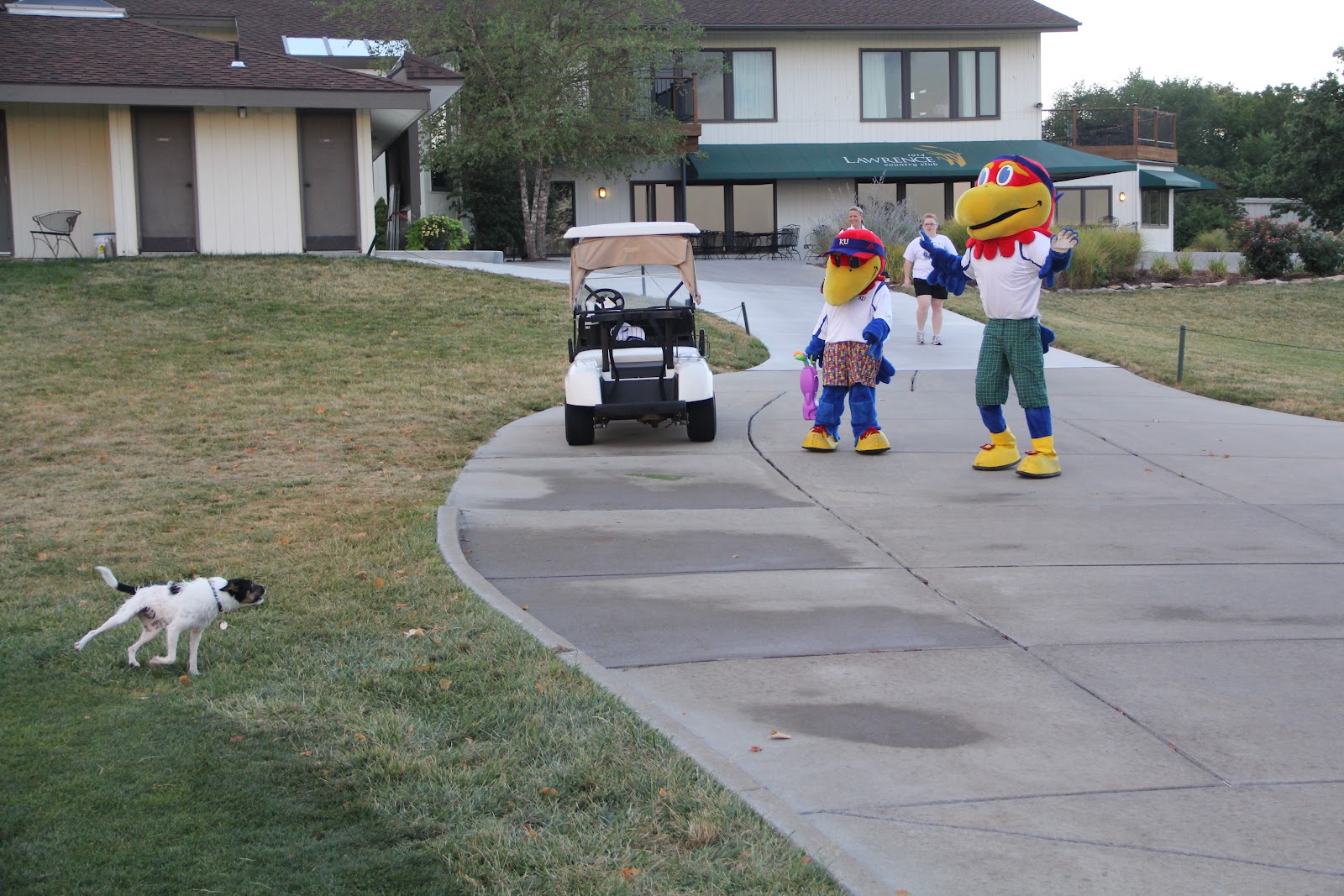 2. The mascots stayed “in character” the entire time they were there. It was 7 a.m., the course is quiet, it’s just me and Bill at the putting green. The two mascots and their two coaches/handlers/attendees (I don’t know what you call someone who assists a mascot… an assistant, I guess) show up. Big Jay wanted a golf ball. He could have walked up and said, “Hey guys, can I borrow a golf ball for this photo shoot?”